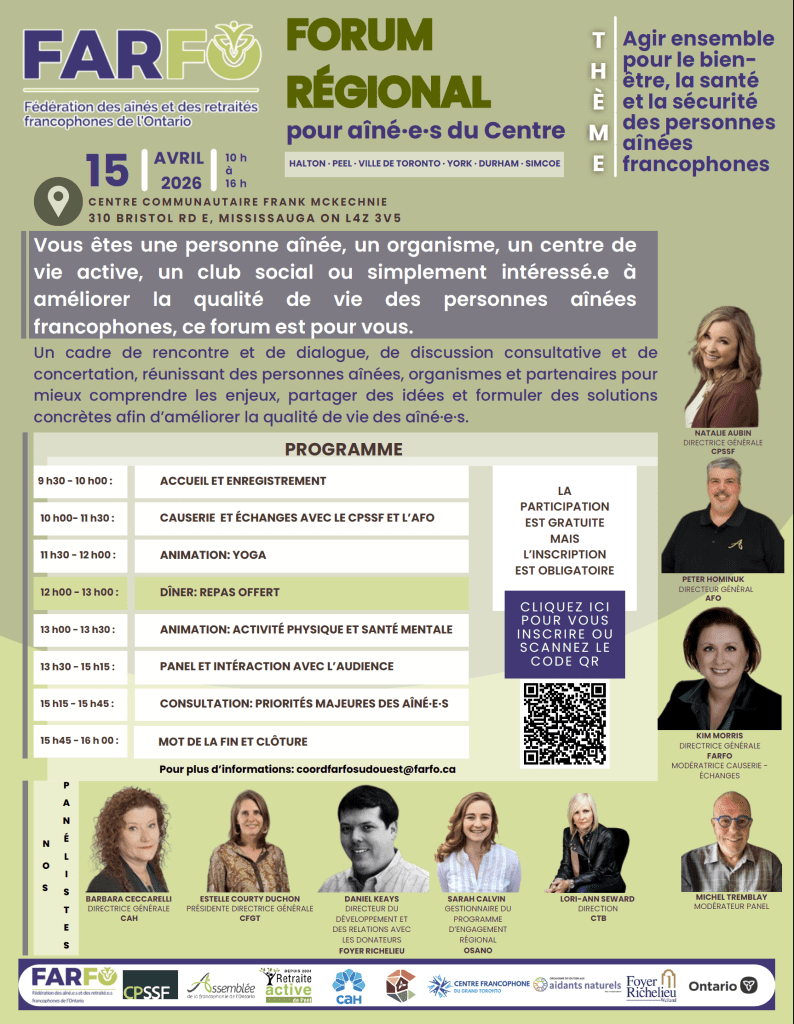 Vous êtes une personne aînée, un organisme, un centre de vie active, un club social ou simplement intéressée à améliorer la qualité de vie des personnes aînées francophones, ce forum est pour vous.